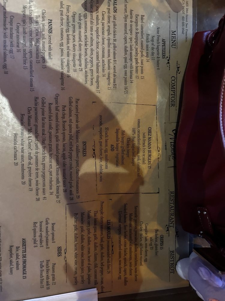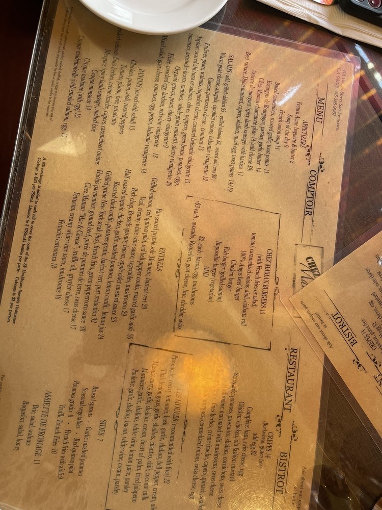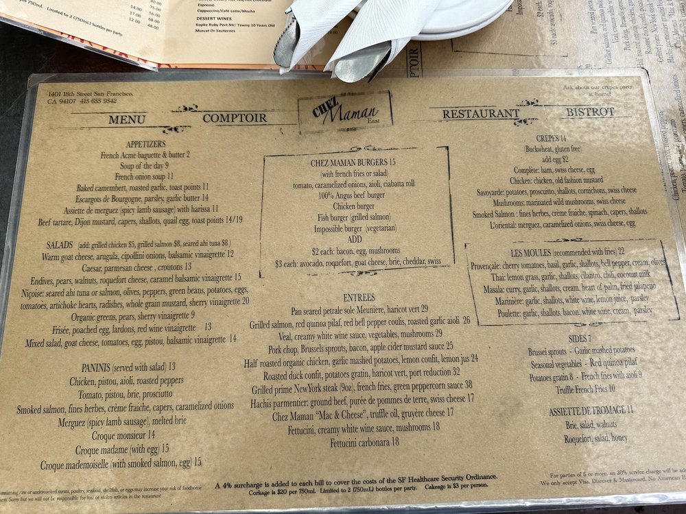 Introducing the menu at Chez Maman East, a charming spot in Potrero Hill offering French cuisine with a twist. With options ranging from crepes to burgers, this restaurant also caters to vegans and vegetarians. The extensive wine list complements classic French dishes and innovative flavors. Customers praise the cozy ambiance and attentive service, making it a perfect spot for a date night or gathering with friends. Standout dishes include the French onion soup, beef burger on ciabatta, and duck confit. The appetizers, like escargot and sausages, are flavorful, while the entrees are cooked perfectly. The outdoor seating, heated patio, and spacious layout add to the overall dining experience. Overall, Chez Maman East offers a delightful combination of tasty food, excellent service, and a warm atmosphere.